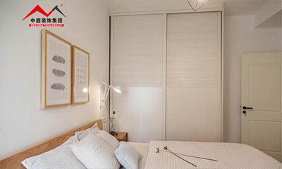 現(xiàn)場(chǎng)訂制的衣柜與房間的大小剛剛合適,推拉式的柜門節(jié)省了不少空間。