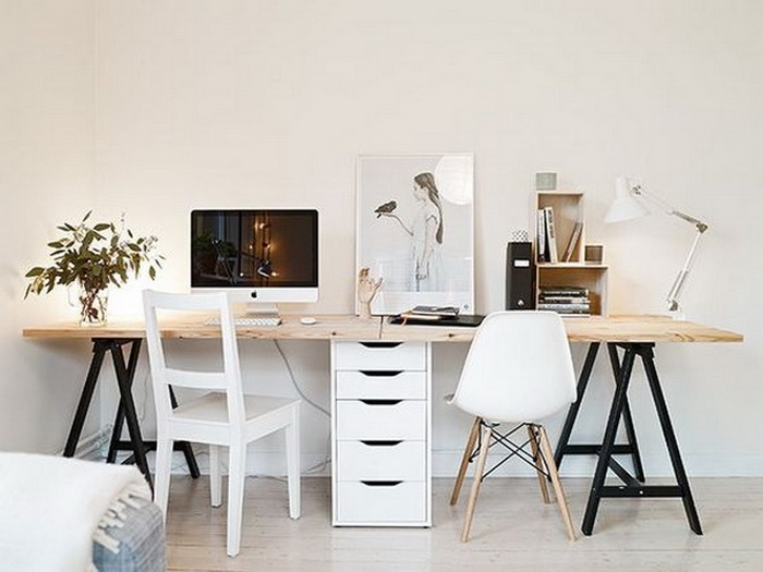 對于兩個人書桌布置,可以對著坐、并排坐或者背靠背,也可以L型轉角坐,看個人喜好和具體空間格局而定。