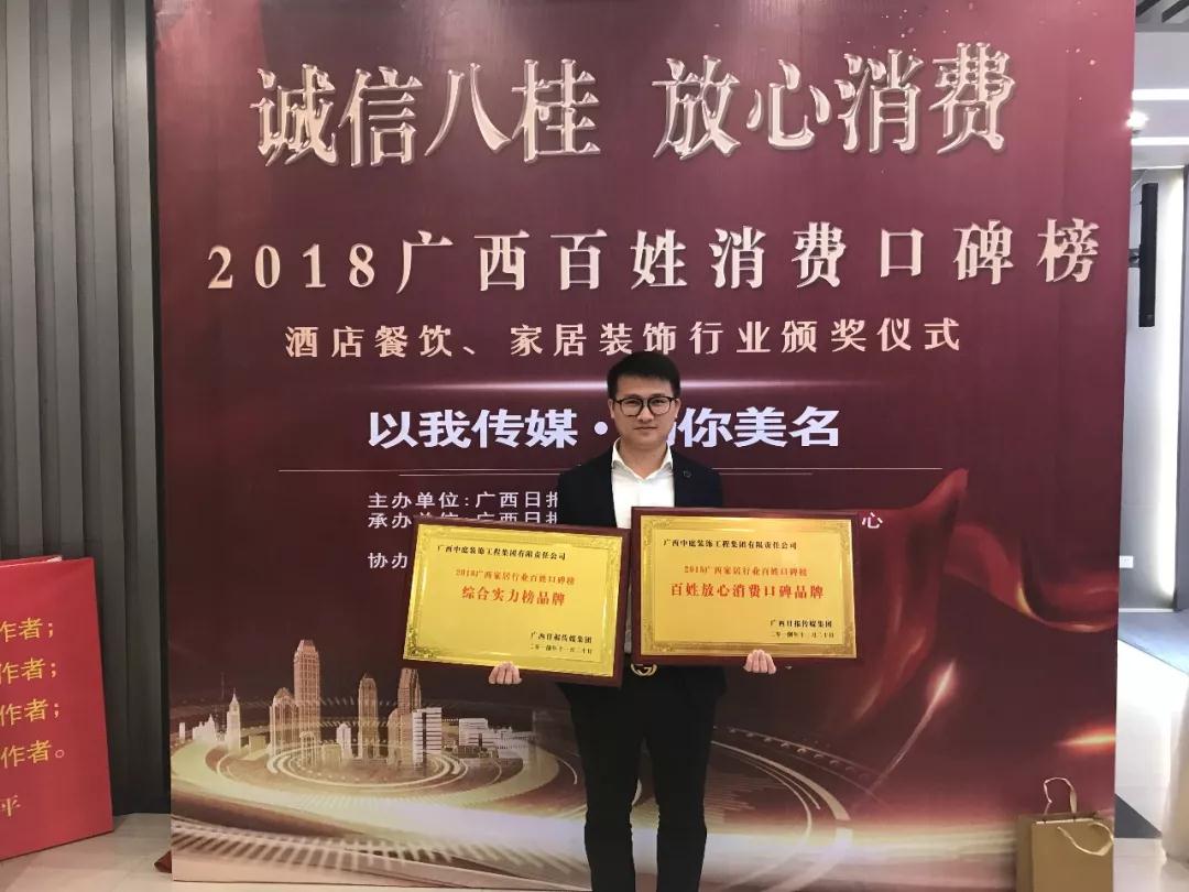 在2018廣西百姓消費口碑榜中,中庭裝飾集團榮獲“百姓放心消費口碑品牌獎和綜合實力榜品牌獎”,由南國早報副總編輯趙永勝和南國早報副總編輯鄧志勇為其頒獎。