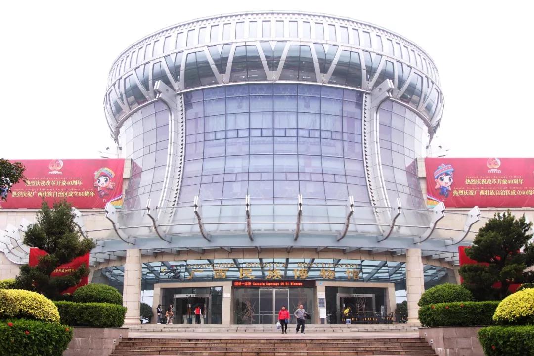 廣西民族博物館主體建筑外形取材于富有廣西地域特色和民族特色的銅鼓,整個(gè)建筑宛如一只展翅高飛的鯤鵬,遨游于青山綠水之間。