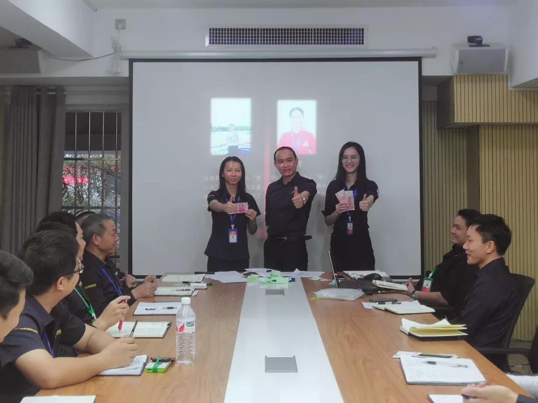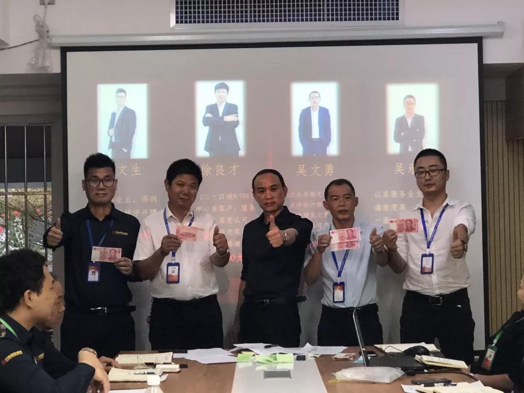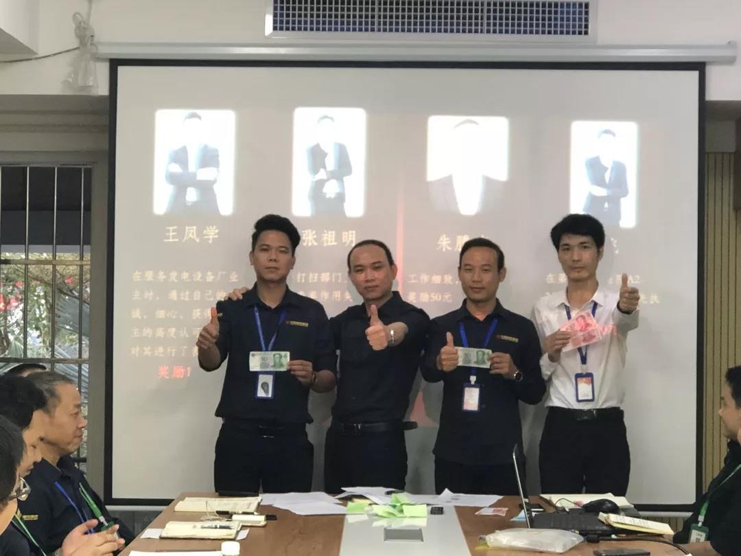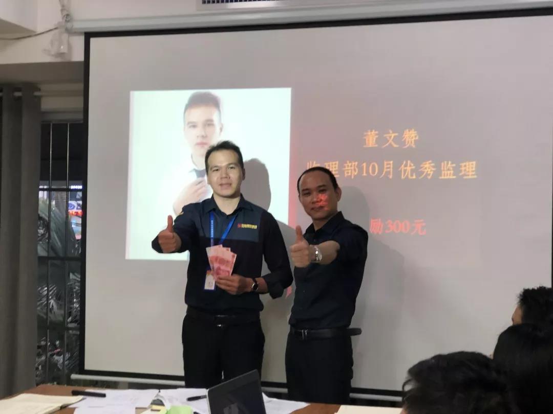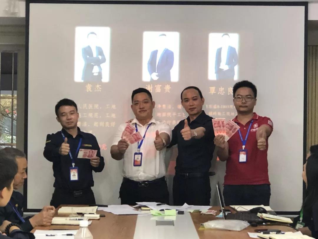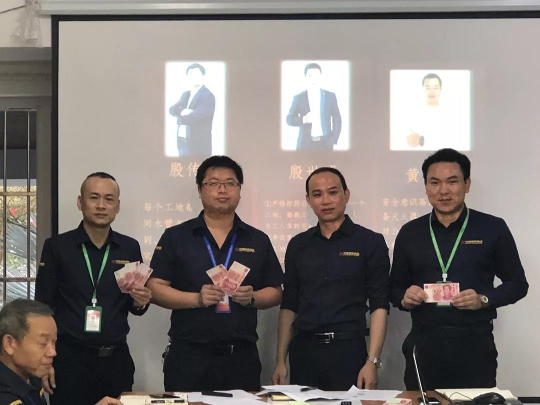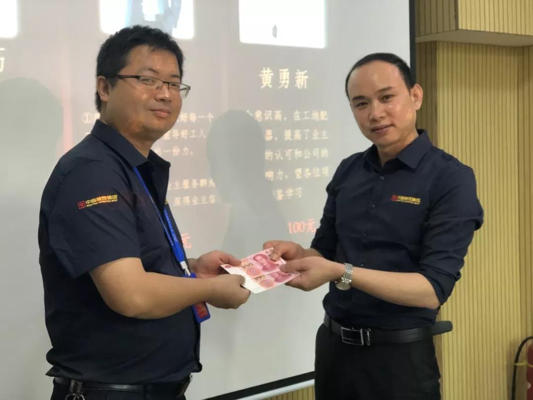 吳總(右一)為項目經理殷傳高頒發月度獎金