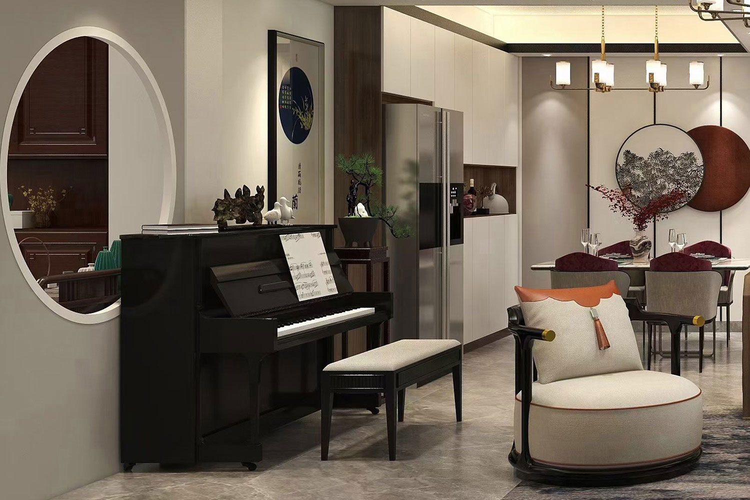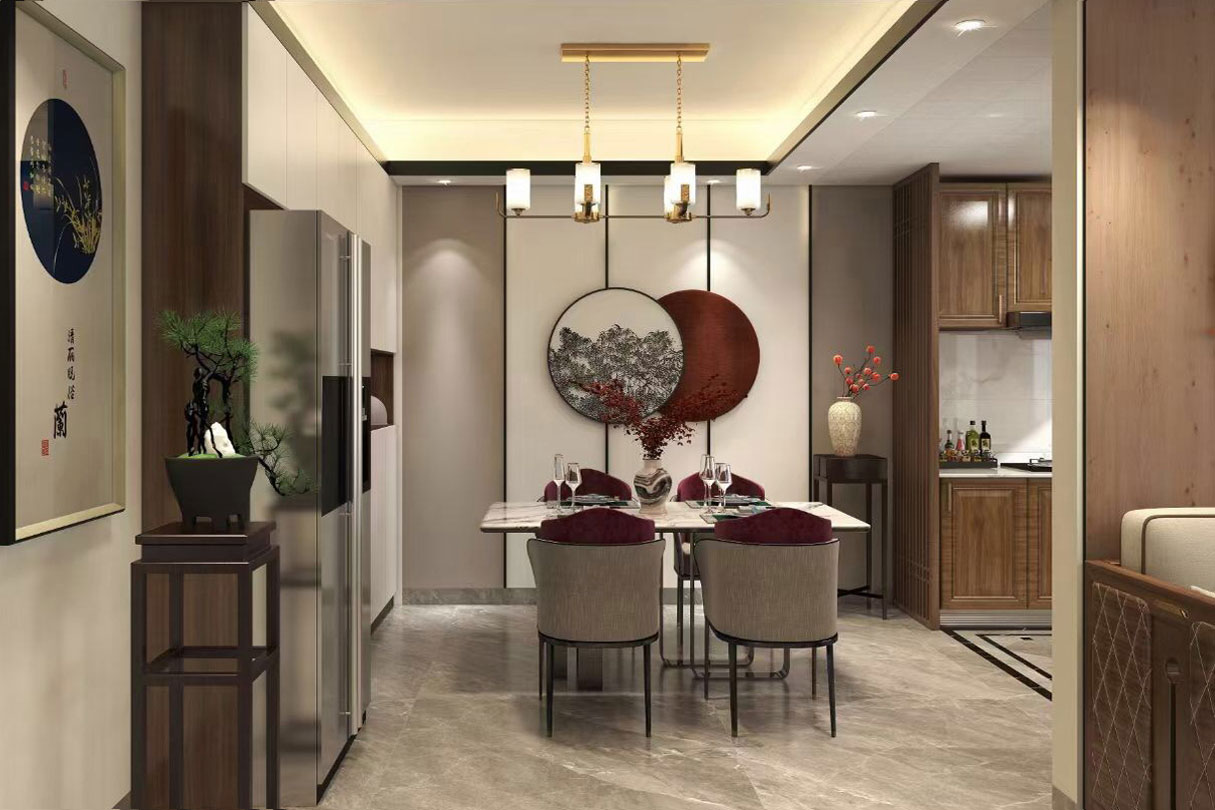 瀏覽量:433天立TT國際258㎡案例,戶型為:四房兩廳兩衛,屬于新中式風格。整體家具陳設講究對稱,重視文化意蘊,整體以深色為主,以古香古色的中式擺件、掛畫來點綴空間,在一些細節上勾勒出禪宗的意境。但同時會使用現代時尚元素,比如附帶金屬邊框的桌椅、花瓶,以及背景掛飾等,使整體的家居設計中既有中式家居的傳統韻味,又有現代家居的時尚大氣。