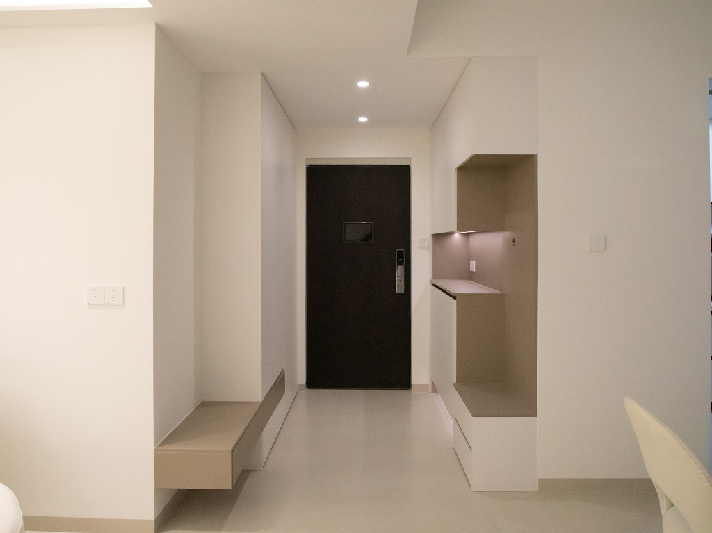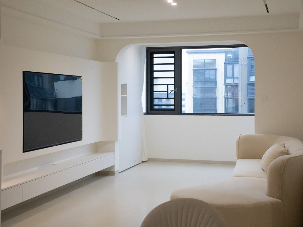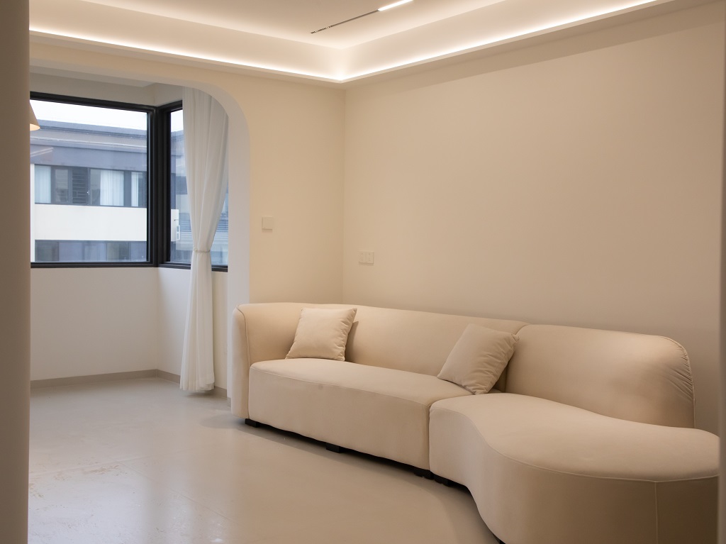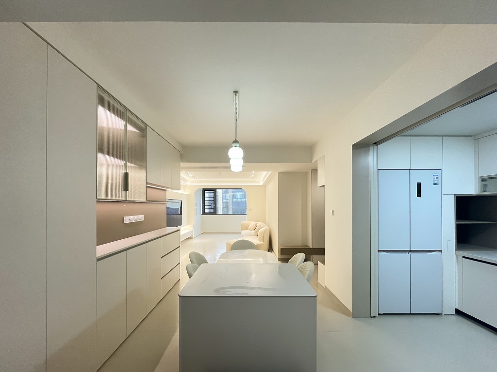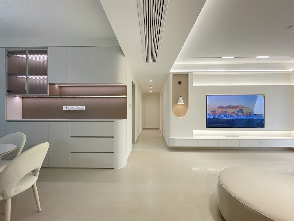 空間整體奶白色調裝飾,耶為空間帶來了充沛的光線,設計師整體結構上不設明顯的界定,在裝修次材料、色彩搭配上逐步描述空間的構成關系。