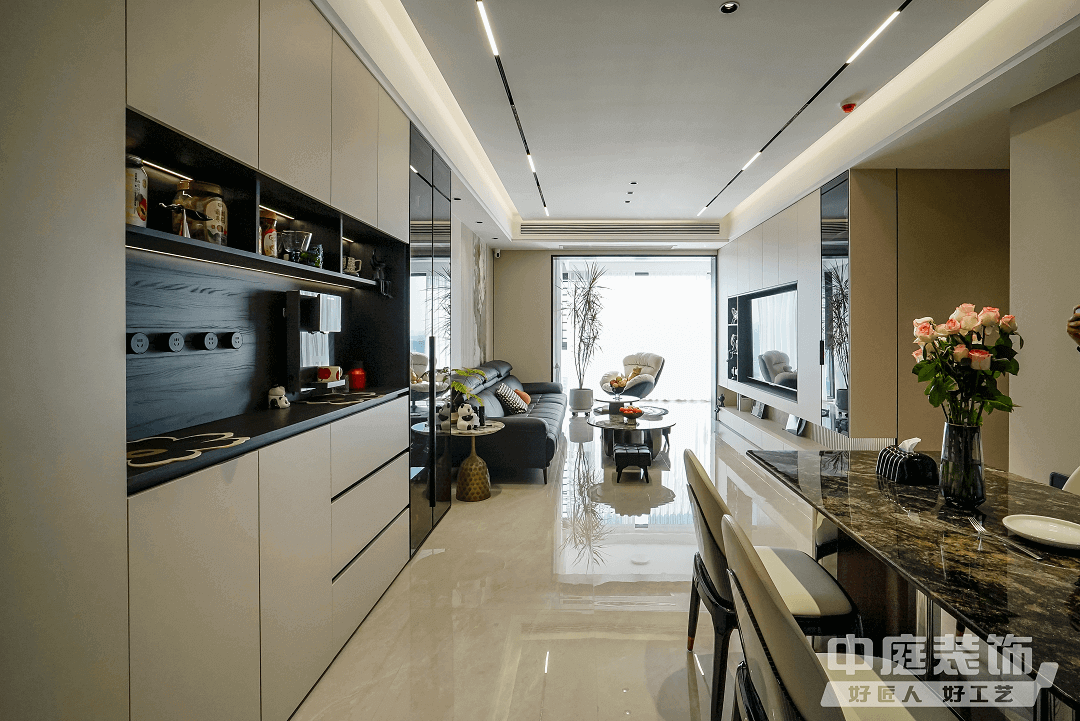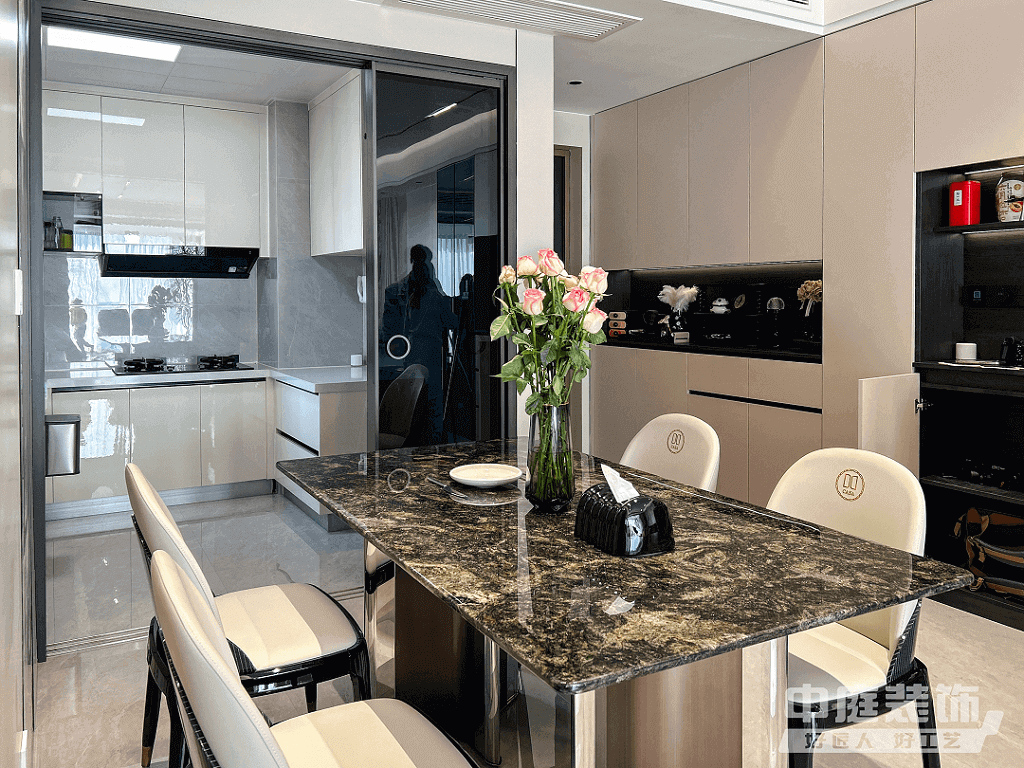 餐廳:開放廚房與餐廳結合,形成餐、廚一體空間。所有廚房電器嵌入式設計,并按照業主烹飪習慣布置,保證操作動線便捷、合理。