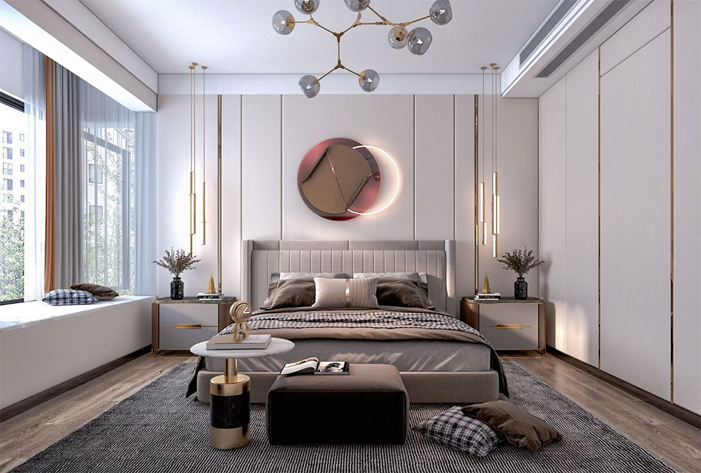 主臥延續了空間整象牙白和駝色與金屬線條裝飾的搭配,這剛好合適的搭配,剛剛好透露出了合適的高貴與優雅。
